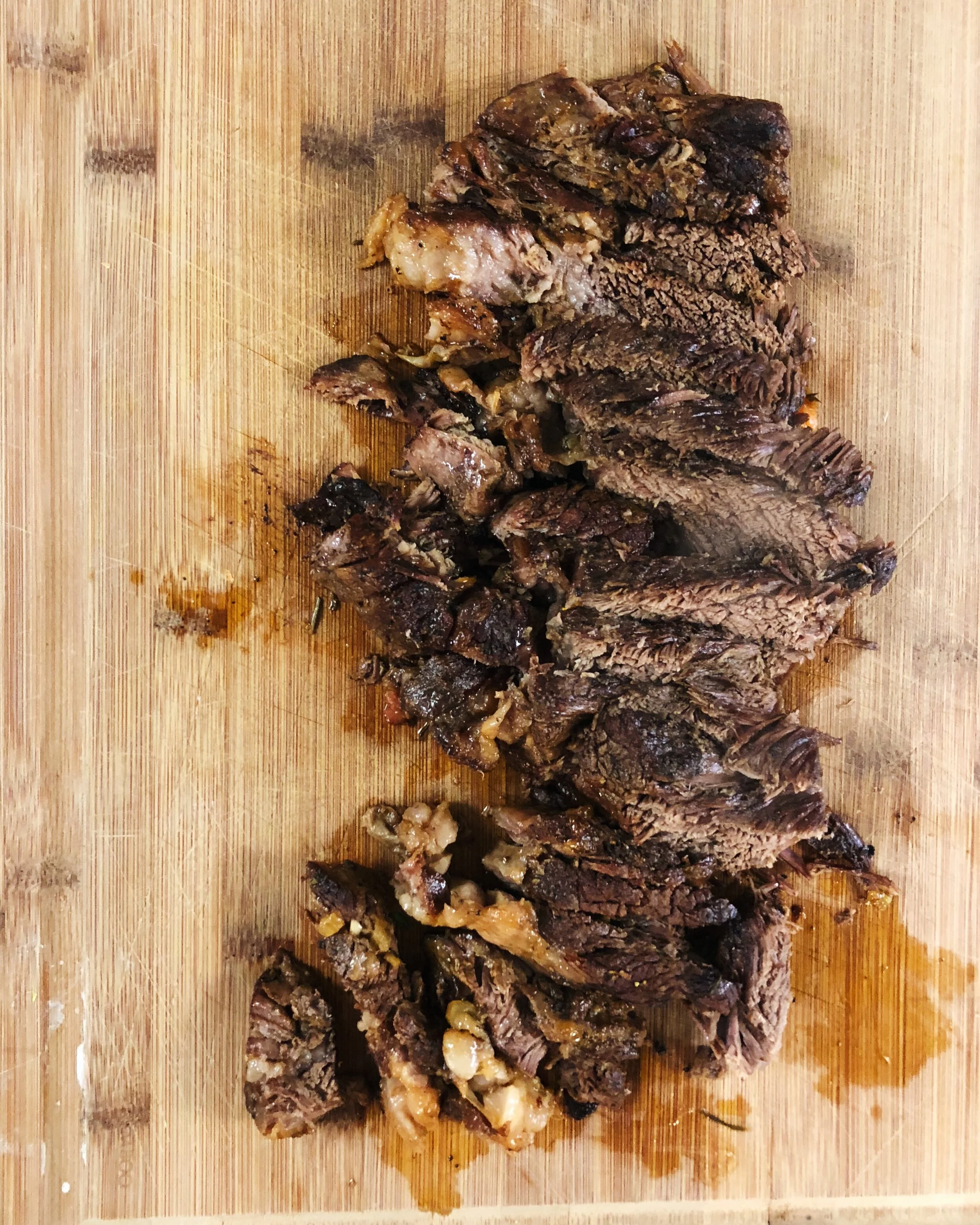 After the two hours have elapsed, remove the dutch oven from the oven, and remove your roast and set aside. Fish out and remove your bay leaves and the remaining woody stems from your herbs. Remove 1/2 of your sauce mixture, and blend in a blender or food processor with about 1 cup of water, and return it back to the pot and stir. This has become your sauce or "gravy." Slice your roast against the grain, and return it to your pot of sauce until you are ready to serve.